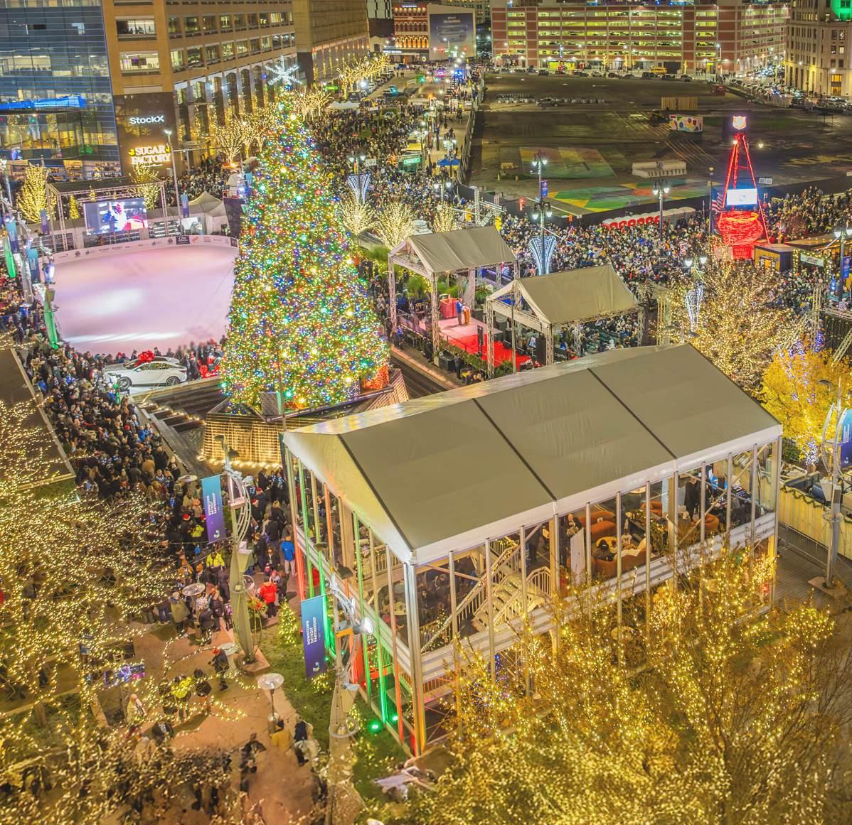 Savor modern cuisine and craft cocktails in a stylish setting. Take in sweeping views of Downtown Detroit and Beacon Park, aglow with thousands of holiday lights and festive décor. Whether you’re dining in Lumen’s contemporary dining room or enjoying a heated, private outdoor chalet on the patio, it’s a holiday experience like no other.