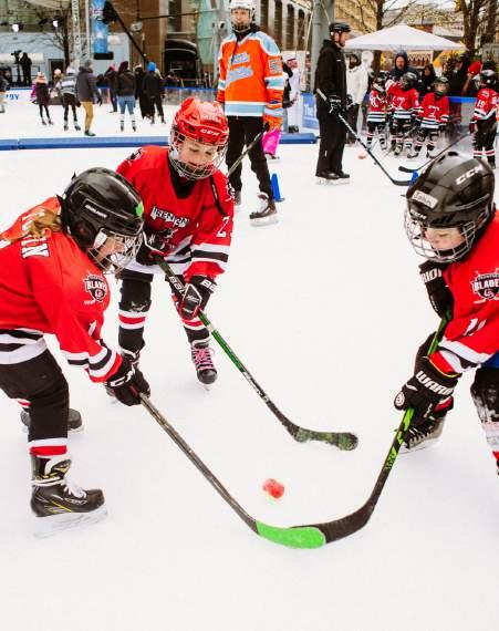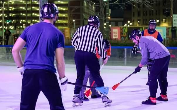 Broomball transforms the ice into action-packed fun, where friends face off in this lively, winter tradition downtown.