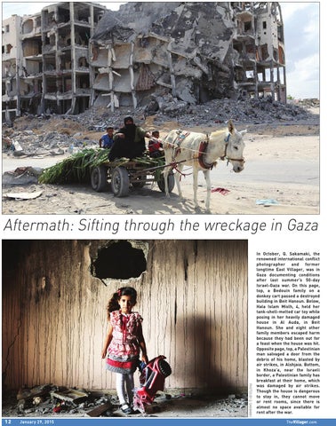 In October, Q. Sakamaki, the renowned international conflict photographer and former longtime East Villager, was in Gaza documenting conditions after last summer’s 50-day Israel-Gaza war. On this page, top, a Bedouin family on a donkey cart passed a destroyed building in Beit Hanoun. Below, Hala Islam Mislh, 4, held her tank-shell-melted car toy while posing in her heavily damaged house in Al Auda, in Beit Hanoun. She and eight other family members escaped harm because they had been out for a feast when the house was hit. Opposite page, top, a Palestinian man salvaged a door from the debris of his home, blasted by air strikes, in Alshjaia. Bottom, in Khoza’a, near the Israeli border, a Palestinian family has breakfast at their home, which was damaged by air strikes. Though the house is dangerous to stay in, they cannot move or rent rooms, since there is almost no space available for rent after the war. TheVillager.com
