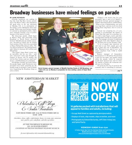 Broadway businesses have mixed feelings on parade BY ALINE REYNOLDS Citywide businesses are cashing in big time from Big Blue victory, according to the Mayor’s office, who announced the good news in the late afternoon of Monday, Feb. 6 in anticipation of the Giants’ Lower Manhattan ticker-tape parade. While some local business managers attested to anticipated profits, others were ironically fretting a loss in profits because of the massive crowds. The ticker-tape parade, which began at Battery Place and proceeded along Broadway to Worth Street, attracted between 500,000 and one million spectators, one-third of which will be coming from outside of New York City, according to Mayor Michael Bloomberg’s office. The city and its businesses, the announcement said, bilked in between $19 million and $38 million. “The Giant’s Super Bowl victory was an incredible win for our City – and now, tomorrow’s ticker tape through the Canyon of Heroes will be another big win for New Yorkers and our small businesses,” said Bloomberg in a statement. On Monday evening, just hours before the parade began, many Downtown store personnel were busily preparing for the notable surge in customers, some of whom were frequenting the Broadway shops as early as dawn.