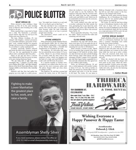 Police arrested a man wielding a large hammer on Pier 25 in the early morning hours of March 6 after breaking into a ship docked at the pier. Police reported that a man tried to break into a ship, The Nantucket, a privatelyowned charter ship that was tied up at the Tribeca pier near Harrison St. The man, Shlomo Avraham, 25, was charged with burglary, criminal possession of a controlled substance, possession of burglars’ tools, criminal mischief for property damage and possession of drug paraphernalia, according to a police spokesperson. Avraham reportedly climbed onboard and broke the hatch with a hammer at about 5:30 a.m. He was apprehended by police officers after a deckhand called the police. Safety on the pier has been a concern since Hudson River Park lost power on many of its piers during Hurricane Sandy. “The pier being dark at night might have encouraged him, a symptom of power being out in Hudson River Park,” said Mary Habstritt, director of the LILAC Preservation Project, which manages exhibits on the historic Lilac steamship at Pier 25. Habstritt said that they had pulled the gangway up every night as a safety precau-
