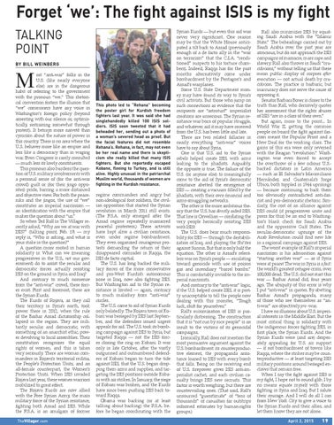 ost “anti-war” folks in the U.S. (like nearly everyone else) are in the dangerous habit of referring to the government with the pronoun “we.” This rhetorical convention fosters the illusion that “we” commoners have any voice in Washington’s foreign policy (beyond assenting with our silence or, optimistically, restraining somewhat through protest). It betrays more naiveté than cynicism about the nature of power in this country. There is no area where the U.S. behaves more like an empire and less like a democracy than in waging war. Even Congress is rarely consulted — much less its lowly constituents. This pronoun also burdens the question of U.S. military involvements with a personal sense of (for the anti-war crowd) guilt or (for their jingo opposites) pride, barring a more distanced and objective view. For both the peaceniks and the jingos, the use of “we” constitutes an imperial narcissism — an identification with the empire that makes the question about “us.” So when Ted Rall in The Villager recently asked, “Why are we at war with ISIS?” (talking point, Feb. 19) — my reply is, “Who is asking, and what is your stake in the question?” A question more rooted in human solidarity is: What can we (meaning progressives in the U.S., not our government) do to assist the secular and democratic forces actually resisting ISIS on the ground in Syria and Iraq? And contrary to much nonsense from the “anti-war” crowd, these forces exist. First and foremost, these are the Syrian Kurds. The Kurds of Rojava, as they call their territory in Syria’s north, took power there in 2012, when the rule of the Bashar Assad dictatorship collapsed in the region. They are militantly secular and democratic, with something of an anarchist ethic, power devolving to local assemblies. Their constitution recognizes the equal rights of women, and this is taken very seriously. There are woman commanders in Rojava’s territorial militia, the People’s Protection Units, and an all-female counterpart, the Women’s Protection Units. When ISIS invaded Rojava last year, these women warriors mobilized to great effect. The Rojava Kurds are now allied with the Free Syrian Army, the main military force of the Syrian resistance, fighting both Assad and ISIS. While the F.S.A. is an amalgam of former TheVillager.com