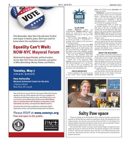Salty Paw space Things are looking up for Amanda Byron Zink, whose pet boutique and grooming business at 38 Peck Slip was trashed by Superstorm Sandy. Still displaced from her original location, she now has a pop-up shop at the end of Pier 17 in the Seaport. The Howard Hughes Corporation has agreed to keep the pier open through Sept. 9 before demolishing the existing mall to make room for a new one. Zink said that after months of trying to reach Howard Hughes management, three weeks ago she got an email from the firm’s new general manager for the mall Phillip St. Pierre. “He knew I was looking for space,” she said, “so he offered temporary space on the pier.” She said her rent was “very fair” for the space formerly occupied by the Sequoia restaurant.