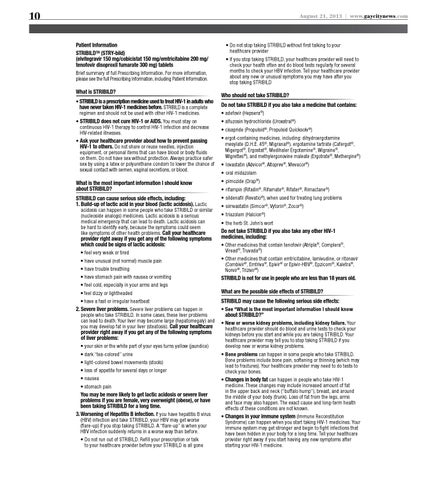 • rifampin (Rifadin®, Rifamate®, Rifater®, Rimactane®) • simvastatin (Simcor®, Vytorin®, Zocor®) • triazolam (Halcion®) • the herb St. John’s wort Do not take STRIBILD if you also take any other HIV-1 medicines, including: • Other medicines that contain tenofovir (Atripla®, Complera®, Viread®, Truvada®) • Other medicines that contain emtricitabine, lamivudine, or ritonavir (Combivir®, Emtriva®, Epivir® or Epivir-HBV®, Epzicom®, Kaletra®, Norvir®, Trizivir®) STRIBILD is not for use in people who are less than 18 years old. What are the possible side effects of STRIBILD? STRIBILD may cause the following serious side effects: • See “What is the most important information I should know about STRIBILD?” • New or worse kidney problems, including kidney failure. Your healthcare provider should do blood and urine tests to check your kidneys before you start and while you are taking STRIBILD. Your healthcare provider may tell you to stop taking STRIBILD if you develop new or worse kidney problems. • Bone problems can happen in some people who take STRIBILD. Bone problems include bone pain, softening or thinning (which may lead to fractures). Your healthcare provider may need to do tests to check your bones. • Changes in body fat can happen in people who take HIV-1 medicine. These changes may include increased amount of fat in the upper back and neck (“buffalo hump”), breast, and around the middle of your body (trunk). Loss of fat from the legs, arms and face may also happen. The exact cause and long-term health effects of these conditions are not known. • Changes in your immune system (Immune Reconstitution Syndrome) can happen when you start taking HIV-1 medicines. Your immune system may get stronger and begin to fight infections that have been hidden in your body for a long time. Tell your healthcare provider right away if you start having any new symptoms after starting your HIV-1 medicine.