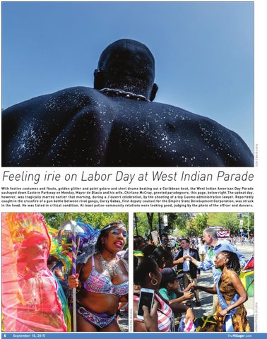Feeling irie on Labor Day at West Indian Parade With festive costumes and floats, golden glitter and paint galore and steel drums beating out a Caribbean beat, the West Indian American Day Parade sashayed down Eastern Parkway on Monday. Mayor de Blasio and his wife, Chirlane McCray, greeted paradegoers, this page, below right.The upbeat day, however, was tragically marred earlier that morning, during a J’ouvert celebration, by the shooting of a top Cuomo administration lawyer. Reportedly caught in the crossfire of a gun battle between rival gangs, Carey Gabay, first deputy counsel for the Empire State Development Corporation, was struck in the head. He was listed in critical condition. At least police-community relations were looking good, judging by the photo of the officer and dancers.