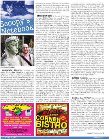 EXPRESS YOURSELF: Speaking of Stringer, he’s on the cover of NYC Community Media’s newest publication, Manhattan Express, a bimonthly newspaper covering Manhattan north of 34th St. Since Villagers “never go north of 14th St.,” you might want to pick up this fine new paper (or read it online) to find out what’s going on up there — quite a lot, from the look of it! It’s edited by Paul Schindler, who also edits Gay City News. Check it out! S.B.J.S.A. ALL THE WAY! Support for the Small Business Jobs Survival Act is gathering steam — and sponsors — in the City Council. In a major pickup, Carlos Menchaca, chairperson of the Council’s Committee on Immigration and a leading new Latino political voice, has now thrown his support behind the S.B.J.S.A. The bill, which would help small merchants negotiate new leases after their old ones run out, has sat dormant in the Council for decades as the powers that be have refused to let it come up for a vote. But with 26 sponsors, the bill now has a majority of support in the 51-member Council. At the end of May, as first reported by The Villager, Council Speaker Melissa Mark-Viverito pledged that the Council would hold hearings on small business, covering the issue of lease extensions, among other things, and all possible legislative solutions. SCOOPY’S continued on p. 7 TheVillager.com