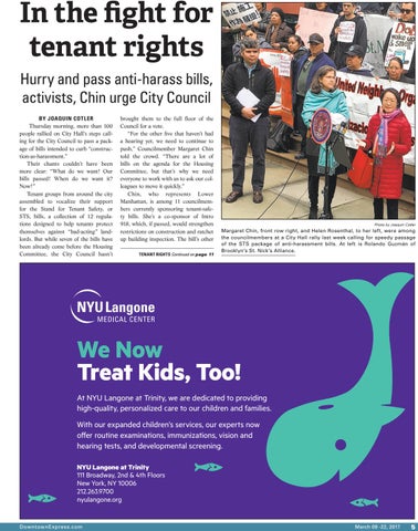 brought them to the full floor of the Council for a vote. “For the other five that haven’t had a hearing yet, we need to continue to push,� Councilmember Margaret Chin told the crowd. “There are a lot of bills on the agenda for the Housing Committee, but that’s why we need everyone to work with us to ask our colleagues to move it quickly.� Chin, who represents Lower Manhattan, is among 11 councilmembers currently sponsoring tenant-safety bills. She’s a co-sponsor of Intro 918, which, if passed, would strengthen restrictions on construction and ratchet up building inspection. The bill’s other tenant rights Continued on page 11