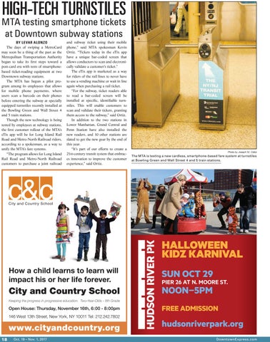 HIGH-TECH TURNSTILES MTA testing smartphone tickets at Downtown subway stations BY LEVAR ALONZO The days of swiping a MetroCard may soon be a thing of the past as the Metropolitan Transportation Authority began to take its first steps toward a post-card era with tests of smartphonebased ticket-reading equipment at two Downtown subway stations. The MTA has begun a pilot program among its employees that allows for mobile phone payments, where users scan a barcode on their phones before entering the subway at specially equipped turnstiles recently installed at the Bowling Green and Wall Street 4 and 5 train stations. Though the new technology is being tested by employees at subway stations, the first customer rollout of the MTA’s eTix app will be for Long Island Rail Road and Metro-North Railroad riders, according to a spokesman, as a way to unify the MTA’s fare systems. “The program allows for Long Island Rail Road and Metro-North Railroad customers to purchase a joint railroad