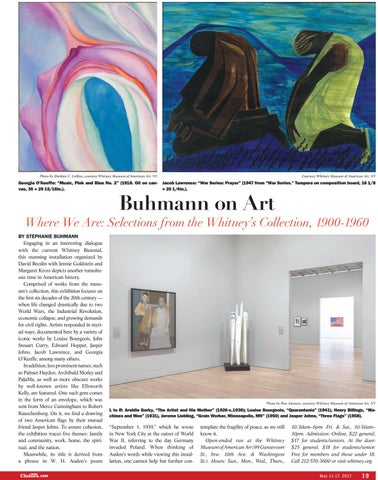 Buhmann on Art Where We Are: Selections from the Whitney’s Collection, 1900-1960 BY STEPHANIE BUHMANN Engaging in an interesting dialogue with the current Whitney Biennial, this stunning installation organized by David Breslin with Jennie Goldstein and Margaret Kross depicts another tumultuous time in American history. Comprised of works from the museum’s collection, this exhibition focuses on the first six decades of the 20th century — when life changed drastically due to two World Wars, the Industrial Revolution, economic collapse, and growing demands for civil rights. Artists responded in myriad ways, documented here by a variety of iconic works by Louise Bourgeois, John Steuart Curry, Edward Hopper, Jasper Johns, Jacob Lawrence, and Georgia O’Keeffe, among many others. In addition, less prominent names, such as Palmer Hayden, Archibald Motley and PaJaMa, as well as more obscure works by well-known artists like Ellsworth Kelly, are featured. One such gem comes in the form of an envelope, which was sent from Merce Cunningham to Robert Rauschenberg. On it, we find a drawing of two American flags by their mutual friend Jasper Johns. To assure cohesion, the exhibition traces five themes: family and community, work, home, the spiritual, and the nation. Meanwhile, its title is derived from a phrase in W. H. Auden’s poem .com