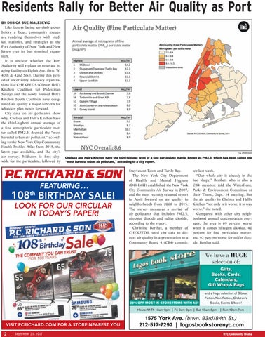 Residents Rally for Better Air Quality as Port BY DUSICA SUE MALESEVIC Like boxers lacing up their gloves before a bout, community groups are readying themselves with studies, statistics, and strategies as the Port Authority of New York and New Jersey eyes its bus terminal expansion. It is unclear whether the Port Authority will replace or renovate its aging facility on Eighth Ave. (btw. W. 40th & 42nd Sts.). During this period of uncertainty, advocacy organizations like CHEKPEDS (Clinton Hell’s Kitchen Coalition for Pedestrian Safety) and the newly formed Hell’s Kitchen South Coalition have designated air quality a major concern for whatever plan moves forward. City data on air pollutants show why: Chelsea and Hell’s Kitchen have the third-highest annual average of a fi ne atmospheric particulate matter called PM2.5, deemed the “most harmful urban air pollutant,” according to the New York City Community Health Profi les Atlas from 2015, the latest year available, and the city’s air survey. Midtown is fi rst citywide for the particulate, followed by