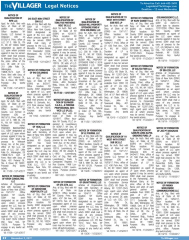NOTICE OF FORMATION OF 940 COLUMBUS LLC Arts. of Org. filed with Secy. of State of NY (SSNY) on 8/25/17. Office location: NY County. SSNY designated as agent of LLC upon whom process against it may be served. SSNY shall mail process to: c/o NOTICE OF QUALIFICAWalter & Samuels, Inc., TION OF ELVINGER 419 Park Avenue South, S.A.R.L., A FOREIGN 15th Fl., NY, NY 10016. PROFESSIONAL SERPurpose: any lawful VICE LLC (PLLC). activity. Authority filed with NY Vil: 11/02 - 12/07/2017 Dept. of State on 10/18/17. Office location: NY County. PLLC orNOTICE OF FORMATION ganized in Luxembourg on 9/28/17. NY Sec. of OF 1836, LLC Articles of Organization State designated agent of filed with Secretary of PLLC upon whom proState of New York (SSNY) cess against it may be on 10/23/17. Office served and shall mail location: NY County. process to: c/o ServCorp, SSNY has been 1330 Ave. of the Ameridesignated as an agent cas, 23rd Fl., NY, NY upon whom process 10019. Luxembourg adagainst the LLC may be dress: 28 Bd Joseph II, Luxembourg. served. The address to L-1840 which SSNY shall mail a Cert. of Org. filed with copy of any process Luxembourg Trade & against the LLC is to: Companies Register, 14 1836 LLC, 1317 1st Rue Erasme, 1468 LuxAvenue, New York, NY embourg L-2961 Luxem10021. Purpose: To bourg. Purpose: practice engage in any lawful act of law. Vill 11/02 - 12/07/2017 or activity. Vil: 11/02 - 12/07/2017 NOTICE OF FORMATION OF EVERSTONE HOSPITALITY LLC Arts. of Org. filed with Secy. of State of NY (SSNY) on 10/23/17. Office location: NY County. SSNY designated as agent of LLC upon whom process against it may be served. SSNY shall mail process to c/o Executive Office, 201 W. 79th St., NY, NY, 10024. Purpose: Any lawful activity. Vil: 11/02 - 12/07/2017