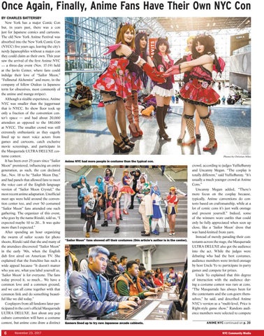 Once Again, Finally, Anime Fans Have Their Own NYC Con BY CHARLES BATTERSBY New York has a major Comic Con but, in years past, there was a con just for Japanese comics and cartoons. The old New York Anime Festival was absorbed into the New York Comic Con (NYCC) five years ago, leaving the city’s nerdy Japanophiles without a major con they could claim as their own. This year saw the arrival of the first Anime NYC — a three-day event (Nov. 17-19) held at the Javits Center, where fans could indulge their love of “Sailor Moon,” “Fullmetal Alchemist” and more, in the company of fellow Otakus (a Japanese term for obsessives, most commonly of the anime and manga stripes). Although a sizable experience, Anime NYC was smaller than the juggernaut that is NYCC. Its show floor took up only a fraction of the convention center’s space — and had about 20,000 attendees as opposed to the 180,000 at NYCC. The smaller crowd was still extremely enthusiastic as they eagerly lined up to meet voice actors from games and cartoons, catch exclusive movie screenings, and participate in the Masquerade ULTRA DELUXE costume contest. It has been over 25 years since “Sailor Moon” premiered, influencing an entire generation, as such, the con declared Sat., Nov. 18 to be “Sailor Moon Day,” and had panels that allowed fans to meet the voice cast of the English language version of “Sailor Moon Crystal,” the most recent anime adaptation. Unofficial meet ups were held around the convention center too, and over 50 costumed “Sailor Moon” fans attended one such gathering. The organizer of this event, who goes by the name Rizuki, told us, “I expected maybe 10 to 20... It was quite more than I expected.” After spending an hour organizing the swarm of sailor scouts for photo shoots, Rizuki said that she and many of the attendees discovered “Sailor Moon” in the early ’90s, when the English dub first aired on American TV. She explained that the franchise has such a wide appeal because “It doesn’t matter who you are, what you label yourself as, ‘Sailor Moon’ is for everyone. The fans today proved it, so much... We have a common love and a common ground, and we can all come together with that common link and do something beautiful like we did today.” Cosplayers from all fandoms later participated in the con’s official Masquerade ULTRA DELUXE. Just about any pop culture convention will have a costume contest, but anime cons draw a distinct