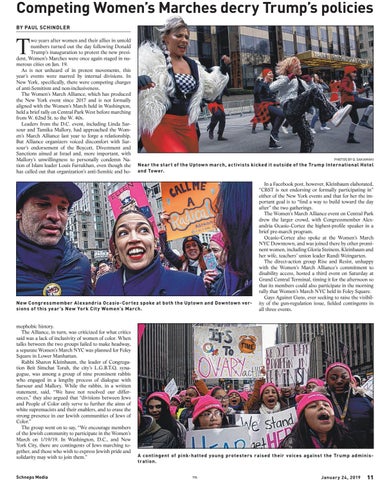 wo years after women and their allies in untold numbers turned out the day following Donald Trump’s inauguration to protest the new president, Women’s Marches were once again staged in numerous cities on Jan. 19. As is not unheard of in protest movements, this year’s events were marred by internal divisions. In New York, specifically, there were competing charges of anti-Semitism and non-inclusiveness. The Women’s March Alliance, which has produced the New York event since 2017 and is not formally aligned with the Women’s March held in Washington, held a brief rally on Central Park West before marching from W. 62nd St. to the W. 40s. Leaders from the D.C. event, including Linda Sarsour and Tamika Mallory, had approached the Women’s March Alliance last year to forge a relationship. But Alliance organizers voiced discomfort with Sarsour’s endorsement of the Boycott, Divestment and Sanctions aimed at Israel and, more important, with Mallory’s unwillingness to personally condemn Nation of Islam leader Louis Farrakhan, even though she has called out that organization’s anti-Semitic and ho-