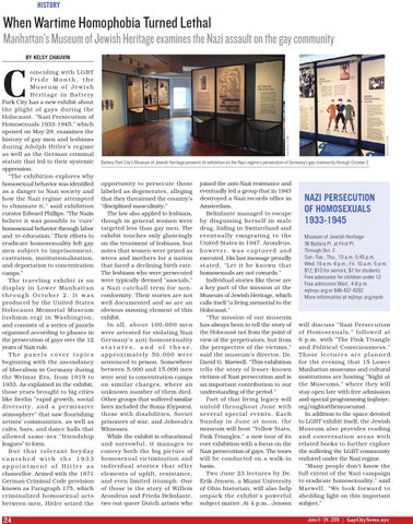 joined the anti-Nazi resistance and eventually led a group that in 1943 destroyed a Nazi records office in Amsterdam. Belinfante managed to escape by disguising herself in male drag, hiding in Switzerland and eventually emigrating to the United States in 1947. Arondeus, h o w e v e r, w a s c a p t u r e d a n d executed. His last message proudly stated, “Let it be known that homosexuals are not cowards.” Individual stories like these are a key part of the mission at the Museum of Jewish Heritage, which calls itself “a living memorial to the Holocaust.” “The mission of our museum has always been to tell the story of the Holocaust not from the point of view of the perpetrators, but from the perspective of the victims,” said the museum’s director, Dr. David G. Marwell. “This exhibition tells the story of lesser -known victims of Nazi persecution and is an important contribution to our understanding of the period.” Part of that living legacy will unfold throughout June with several special events. Each Sunday in June at noon, the museum will host “Yellow Stars, Pink Triangles,” a new tour of its core exhibition with a focus on the Nazi persecution of gays. The tours will be conducted on a walk-in basis. Two June 23 lectures by Dr. Erik Jensen, a Miami University of Ohio historian, will also help unpack the exhibit’s powerful subject matter. At 4 p.m., Jensen