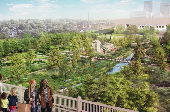 Eleven acre urban park and open space featuring art installations, recreational lawn and water features and a great lawn and stage to host performances.