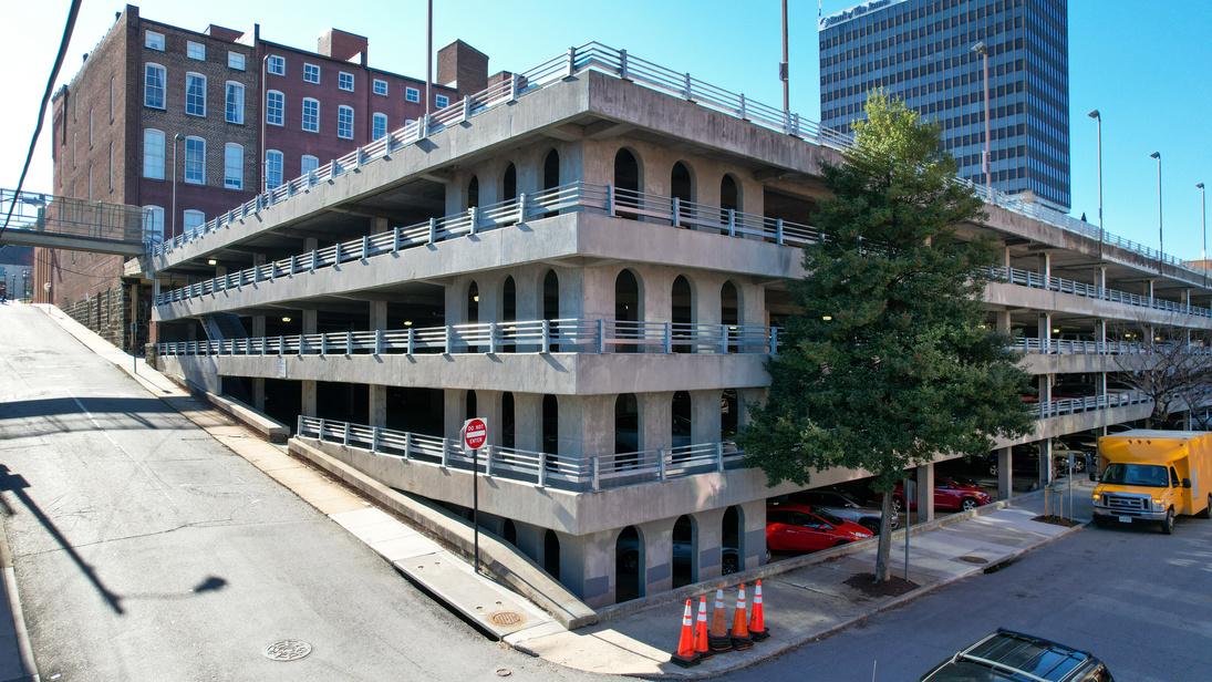 The Midtown Parking Deck proved to be the perfect location to add vibrant murals as it served as a double initiative: to bring more awareness to an underutilized public parking garage and to add color and vibrancy to an unattractive structure From design to completion, this two-month project took 80+ volunteers and an estimated 240 hours of painting. The resulting murals have enlivened the corner of Commerce and 10th Streets, and have helped hundreds to discover a previously overlooked public parking location for their downtown visits. The Midtown Parking Deck Murals were generously sponsored by Bank of the James.