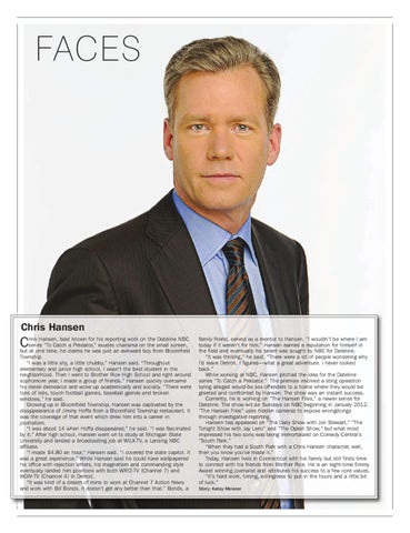Chris Hansen hris Hansen, best known for his reporting work on the Dateline NBC series “To Catch a Predator,” exudes charisma on the small screen, but at one time, he claims he was just an awkward boy from Bloomfield Township. “I was a little shy, a little chubby,” Hansen said. “Throughout elementary and junior high school, I wasn’t the best student in the neighborhood. Then I went to Brother Rice High School and right around sophomore year, I made a group of friends.” Hansen quickly overcame his meek demeanor and woke up academically and socially. “There were tons of kids, touch football games, baseball games and broken windows,” he said. Growing up in Bloomfield Township, Hansen was captivated by the disappearance of Jimmy Hoffa from a Bloomfield Township restaurant. It was the coverage of that event which drew him into a career in journalism. “I was about 14 when Hoffa disappeared,” he said. “I was fascinated by it.” After high school, Hansen went on to study at Michigan State University and landed a broadcasting job at WILX-TV, a Lansing NBC affiliate. “I made $4.80 an hour,” Hansen said. “I covered the state capitol. It was a great experience.” While Hansen said he could have wallpapered his office with rejection letters, his magnetism and commanding style eventually landed him positions with both WXYZ-TV (Channel 7) and WDIV-TV (Channel 4) in Detroit. “It was kind of a dream of mine to work at Channel 7 Action News and work with Bill Bonds. It doesn’t get any better than that.” Bonds, a