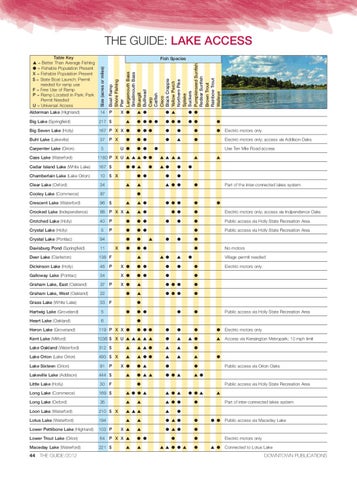 THE GUIDE: LAKE ACCESS Boat Ramp Shore Fishing Pier Largemouth Bass Smallmouth Bass Bluegill Bullhead Carp Catfish Cisco Black Crappie Yellow Perch Northern Pike Splake Suckers Pumpkinseed Sunfish Redear Sunfish Brown Trout Rainbow Trout Walleye