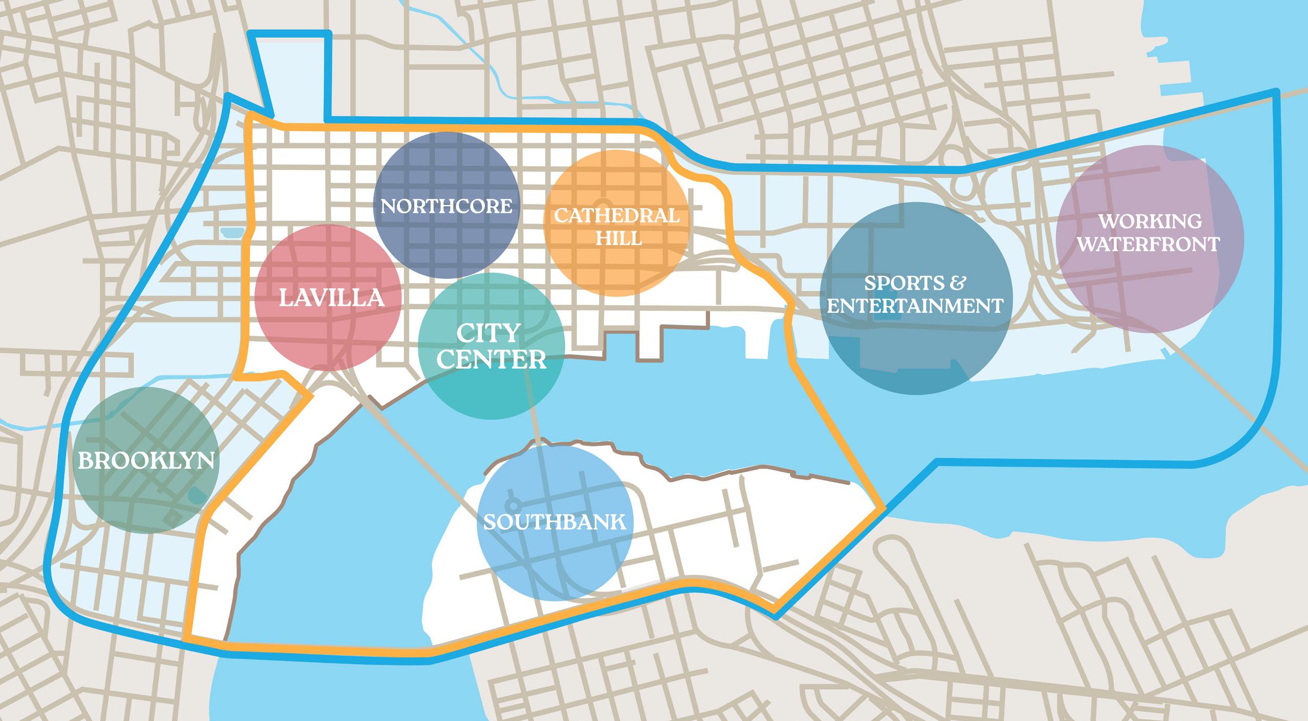 Composed of eight distinct districts, Downtown sits on the St. Johns River centered in the heart of Jacksonville, Florida.