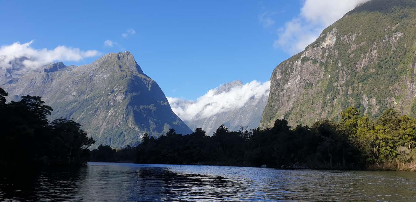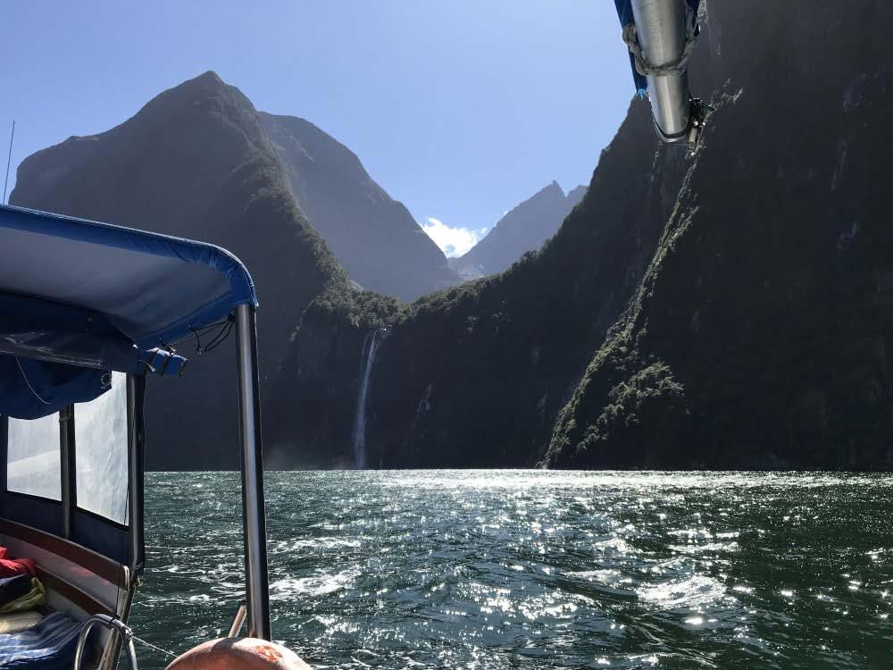 EnteringtheFiordundersail, aboardbyownweeship,was somethingelsealtogether. Thesun, thebreeze,theblueskyandof course,thespectacularscenery… aroundandabove…thesheercliffs, theglacieruponMountPembroke, StirlingandBowenFallsandtheallfamiliarvistalookingbackoutofthe SoundatMitrePeak…itwas perfect.