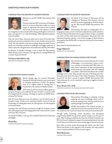 Welcome to the 16th DOXA Documentary Film Festival. This year marks the 150th anniversary of Confederation. It is a time to share what makes our country unique, to appreciate the road we have travelled, and to look to the future with optimism. Canada has a long history of documentary filmmaking, and the genre continues to play a starring role in our cultural landscape, reflecting diverse perspectives and realities. Over the next 11 days, Vancouver plays host to some of the best independent documentary productions from across Canada and around the world. The wide selection of juried screenings, along with public forums, panels and workshops, promises to challenge and engage audiences, as well as inspire the next generation of Canadian documentary filmmakers. As Minister of Canadian Heritage, I want to thank The Documentary Media Society and its volunteers and organizers for making DOXA such a success. Enjoy the festival!