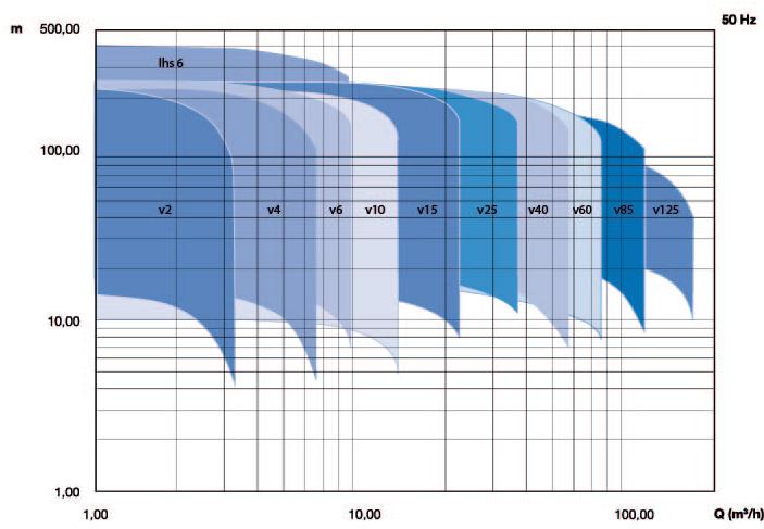 De bovenstaande grafieken geven een totaaloverzicht van het werkgebied van de pompenreeks. Gedetailleerde grafieken per serie inclusief efficiëntie, NPSHreq, en benodigd vermogen zijn verderop in dit hoofdstuk te vinden.