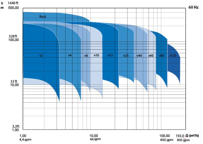 The performance diagrams give a global overview of all the pump models the shaded models are mentioned in this documentation. Detailed characteristics are given for each model showing the hydraulic efficiency, NPSHreq, and shaft power as well.
