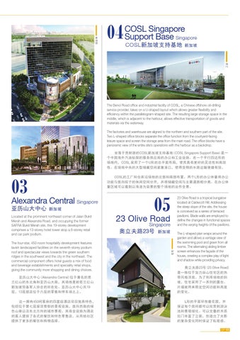 坐落于贲耐路的 COSL新加坡支持基地( COSL Singapore Support Base)是一 个中国海外汽油钻探的服务供应商的办公和工业设施。在一个平行四边形的 场地内, COSL 采用了一个 U形的总平面布局,使其具有更好的灵活性和高效 性。在场地中央的大型储藏空间紧靠港口,使得货物的水路运输便捷有效。