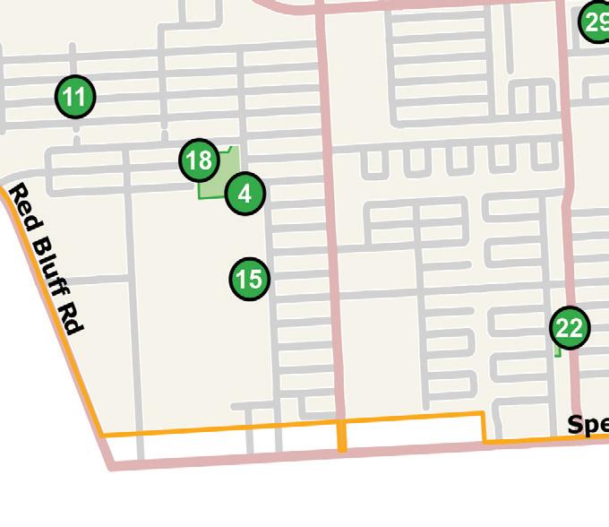 Park Name Address Acres Basketball Court Fitness Equipment Free Wi Fi Pavillion Multipurpose Open Space Park Lights Picnic Tables Playground Structure Restrooms Rose Garden Sports Fields Swimming Pool Tennis Courts RC Rock Crawler Park Volleyball Court Disc Golf Course Butterfly Garden Walking Trail Miles 17 Avon Park 601 W Eight St 3 0 14 18 Bayou Bend 4200 Kalwick Dr 8 0 26 19 Big Bend Park 1600 Big Bend Lane 2 03 0 17 20 Brookhollow Park 3117 Brookhollow Dr 0 69 21 Brownwind Park 3901 Brownwind Trail 2 54 0 25 22 College Park 4615 College Park Dr 1 0 3 23 Deer Meadows Park 2500 Oklahoma Ave 2 18 0 27 24 Dow Park 610 E San Augustine 40 1 25 East Meadows Park 5000 E Meadows Dr 0 79 26 Ella and Friends Dog Park 500 W 13th Street 1 46 27 McHenry Park 1201 Center Street 3 2 0 16 28 Monroe Park 1560 Monroe Street 1 6 29 Nedith Park 3717 Nedith Lane 1 2 30 Park Green 1000 Wynfield Dr 5 1 31 Park Meadows Park 1414 South Parkway Dr 5 0 27 32 Parkside Place Park 3400 Surrey Lane 0 72 0 05 33 Parkview Park 1109 Brookhollow Dr 0 61 34 Heritage Park Patrick s Cabin 1410 Center Street 35 Running Brook Park 1400 Comanche Street 3 36 Terrace Park 126 West 3rd 1.1 37 Tiffany Amber Park 1800 Brookamber Circle 1 1 38 Wynfield Park 1610 Wyngate 3 39 Cottonwood Park 4215 Alta Lane 1 1 0 1 40 Deer Park Nature Preserve 2500 E 13th Street 1 5 P Street Detention Pond 1800 E P Street 7 94 0 43 P Street Right of Way 2600 E P Street 7