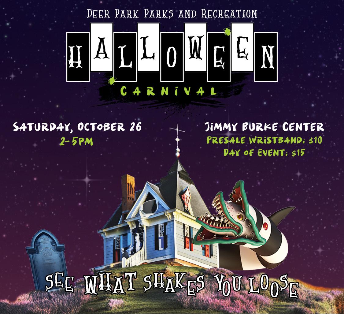 Turn on the juice and see what shakes loose at this year's Halloween Carnival! We're going out with a Beetlejuice theme and looking for action. Join us for Pumpkin Town games, a costume contest, concessions, Beetlejuice themed scarecrow decorating contest, and more! Wristbands are $10 (ages 1 & up) and available starting September 30 by phone (281-478-2050), in person (709 E. P Street), or online at www.deerparktx.gov/parksandrec until October 25. Day-of wristbands are $15. Prepurchased wristbands can be picked up at Jimmy Burke Activity Center on October 24-25, 4-8pm. Come on out and make our millennium!