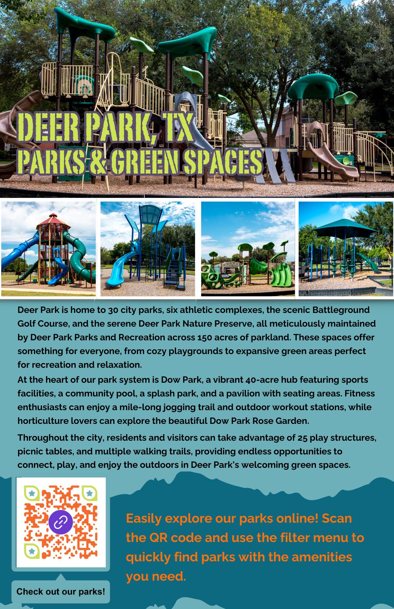 At Deer Park Parks and Recreation, we are committed to building and maintaining accessible, inclusive, and sustainable parks and recreation programs that deliver powerful benefits to our community. From creating safe spaces for play to promoting environmental stewardship and community wellness, we work year-round to ensure that our parks serve everyone. Join us in celebrating Parks and Recreation Month! Stay tuned for the official Parks and Recreation Month Calendar, filled with exciting events, activities, and ways to engage with your local parks. Let’s come together to appreciate the spaces—and the people—who make our community stronger.