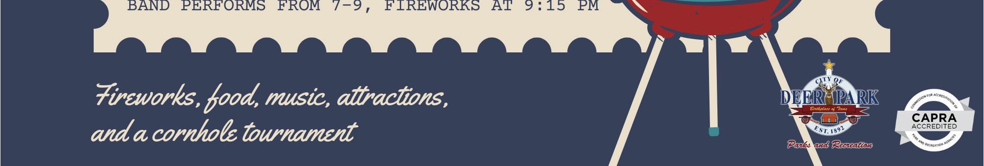You are invited to help celebrate Independence Day with fireworks, music, food, and attractions. There will also be a Cornhole Tournament starting at 5 PM but come early and sign up at 4:30 PM. First place team of 2 wins a a speaker cooler. Come enjoy your day with us. Doors open at 5pm, Band from 7-9 PM, Fireworks at 9:15 PM.