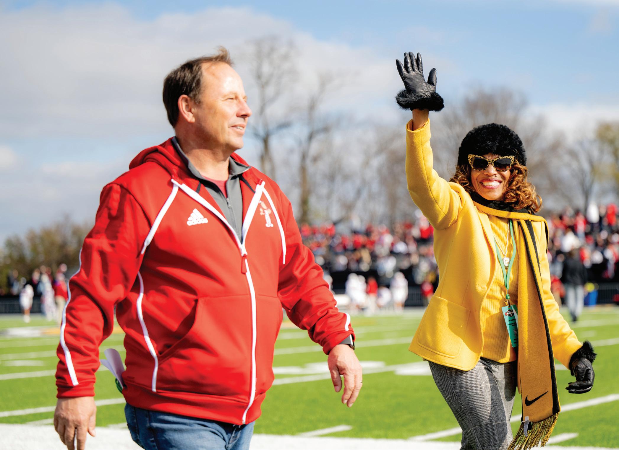 Wabash President Scott E. Feller and DePauw President Lori S. White greet fans before the 130th Monon Bell game played in Greencastle.