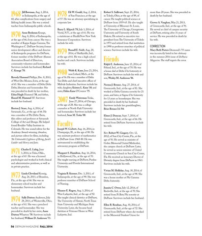 Joseph W. Corbett, Aug. 16, 2014, in Champaign, Ill., at the age of 80. He was assistant professor of mathematics at DePauw from 1968-80. He was instrumental in establishing the astronomy program at DePauw. Margaret S. Hamilton, Aug. 16, 2014, in Hollywood, Fla., at the age of 70. She taught nursing at DePauw, Purdue University and Florida International University. Virginia B. Kremer, Dec. 3, 2011, of Indianapolis, at the age of 90. She was professor emeritus of DePauw School of Nursing. Eleanor E. Ragon, Aug. 3, 2014, of West Lafayette, Ind., at the age of 92. She taught clinical dietetics at DePauw, The University of Hawaii, North Texas State University and Michigan State University. Later, she became head dietitian at Veterans’ Home in West Lafayette, Ind.