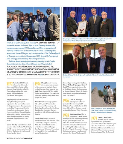 Leslie Baird McDonald released her fifth book, Journeys with Horses. Leslie and her husband, Doug Froh, live at Full Cry Farm in Batavia, Ohio. Her email address is fcfarm@aol.com. (See Recent Words, page 9.) Sally Draper Zoll works for United Through Reading, a nonprofit organization that has been her passion for the past nine years. The organization received the Congressional Medal of Honor Society’s Community Service Hero Award. United Through Reading helps military families maintain strong bonds during deployment by reading storybooks together by video. (See photo.) Dennis B. Kelley is president and chief executive officer for Pacific World Trade, Inc. He was the guest speaker, Sept. 27, 2016, for The Robert C. McDermond Center Speaker Series. 34 DEPAUW MAGAZINE FALL 2016