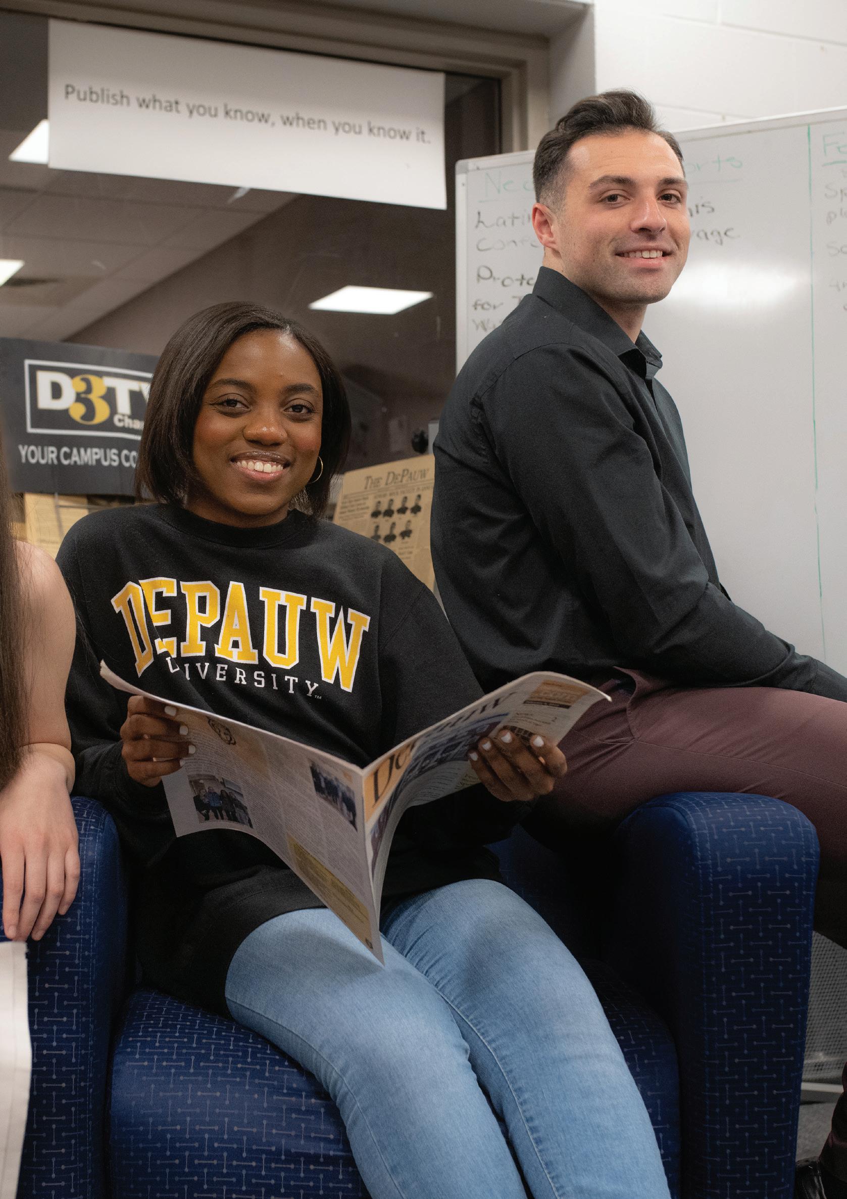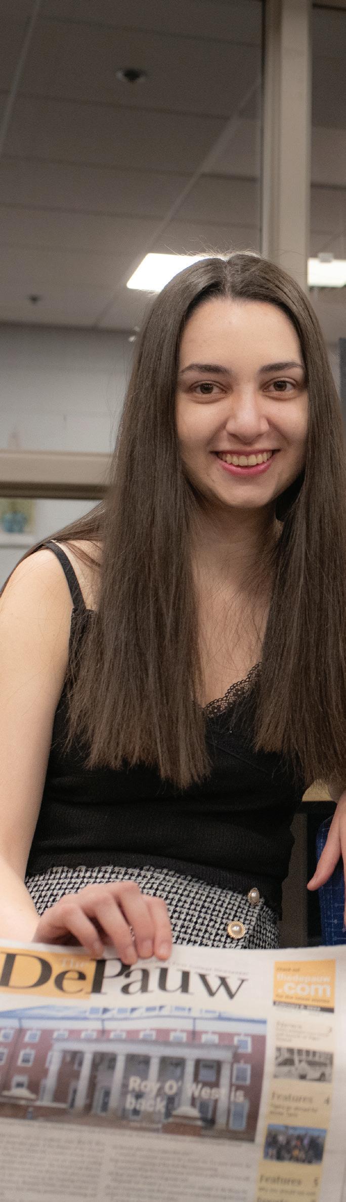 DePauw doesn’t have a journalism school. Yet our university does not lack for impressive alumni in the ranks of professional news writers, reporters and anchors. Perhaps it’s our history as the founding home of the Society of Professional Journalists. Or the resource-rich Pulliam Center for Contemporary Media which provides DePauw undergraduates, regardless of prior experience or course of study, access to handson training in mass media communications. Talk to students at the Pulliam Center and you’ll hear some of the aforementioned points. What you’ll also hear is an appreciation for their liberal arts curriculum and how it sets them apart.