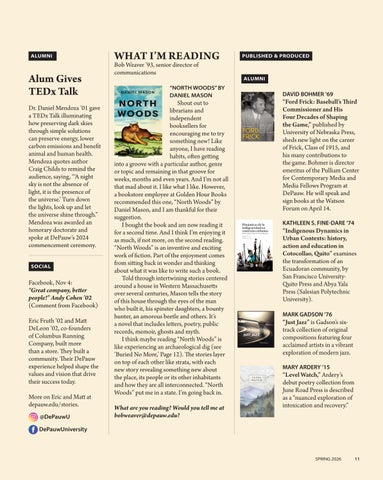 Shout out to librarians and independent booksellers for encouraging me to try something new! Like anyone, I have reading habits, often getting into a groove with a particular author, genre or topic and remaining in that groove for weeks, months and even years. And I’m not all that mad about it. I like what I like. However, a bookstore employee at Golden Hour Books recommended this one, “North Woods” by Tiro Daniel Mason, and I am thankful for their suggestion. Dinámicas de la I bought the book and am now reading it indigeneidad en contextos urbanos for a second time. And I think I’m enjoying it as much, if not more, on the second reading. “North Woods” is an inventive and exciting work of fiction. Part of the enjoyment comes from sitting back in wonder and thinking about what it was like to write such a book. Told through intertwining stories centered around a house in Western Massachusetts over several centuries, Mason tells the story of this house through the eyes of the man who built it, his spinster daughters, a bounty hunter, an amorous beetle and others. It’s a novel that includes letters, poetry, public records, memoir, ghosts and myth. I think maybe reading “North Woods” is like experiencing an archaeological dig (see ’Buried No More,’ Page 12). The stories layer on top of each other like strata, with each new story revealing something new about the place, its people or its other inhabitants and how they are all interconnected. “North Woods” put me in a state. I’m going back in. Una exploración arqueológica de Pichincha Occidental, segunda edición Ronald Lippi