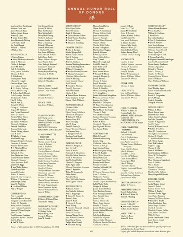 Gail Achtner Hawk Jerome W. Helm Mary Ball Hoeltzel Neva Stahley Julich Nancy Neal Keating Merle D. Lehman Berenice Lueder Lewis Mary L. Manning Richard F. Maroney Lester B. Mathieson F. Michael McLain Kay Kenna McMaster Sue Galbraith Roberts Judith Roser Smith Nancy Holmes Sprague Carol Hauser Stark Carol Rudolph Stoddard Laurence D. Stoddard Gail Loomis Ward Beverly Bryan Wirsching Theodore R. Wolfe GIFTS IN MEMORY OF Robert F. Mirrielees SPECIAL GIFTS Patricia Harms Canfield James C. Van Horne OTHER GIFTS Donald K. Ramsey LEGACY GIFTS Jane Jones Williams