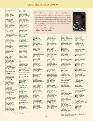 Judeth Kropp Macdonald Roger W. Martens Deanna Goodrich McMain Joyce Mix Meister Phillip L. Mow Barbara Prescott Mueller Marcia Rothweiler Norman Katrina Longenecker Nummela Judith Laadt O’Dell John B. Olson Robert M. Oswalt Meredith Towner Palmer Donald K. Rich Paul B. Sabine Lynn A. Schreiber John W. Slater III Anne Austin Smith Robert P. Snyder Patricia Harmison Stanbery Maryan Bauer Tebbutt Nadine Tovey Thornton Margaret Stahl Tomlin Elizabeth Prunty Weber Nancy Farnham Wickenhauser Lucy Freehafer Wold SPECIAL GIFTS Rance E. Crain Robert J. Darnall Michael A. Herrell Virginia Walsh Knight OTHER GIFTS Patricia Zwickel Godwin Jane Medaris Paine LEGACY GIFTS D. Sidney Condit Jane Medaris Paine Sandra Ohley Wingate