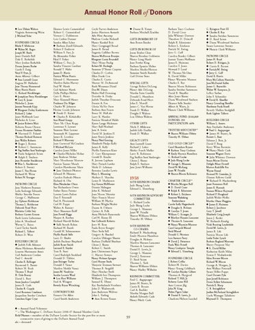 Annual Honor Roll of Donors ◆ Lou Ubben Walton Virginia Armstrong Weise J. Michael Yohe FOUNDERS CIRCLE Merle F. Allshouse ◆ Walter M. Bagot Joseph M. Beals Janet Daniels Bell Dale E. Berkebile Mary Jordan Berkebile Donna Jensen Burke Garth F. Essig Veryl F. Frye, Jr. Anne Allaway Gilbert ◆ Ann Luttrell Grant Eugene N. Halladay Jane Thoma Hammond Mary Harris Harris G. Richard Hershberger ◆ Josephine Petry Hershberger ◆ Gary E. Jones Nicholas L. Jones Jeanne Petracek Kipp ◆ Margaret Dailey Kuehrmann Richard J. Laker Janet Hoffmark Laut Nicholas A. Lyras ◆ Janice Roberts Mair Roberta Bruns Oleson Donna Hostetter Peebles ◆ Maynard D. Poland Thomas Richard Ransom Jean Wallin Roberts ◆ Roger J. Rowen ◆ Robert C. Sammons ◆ Peg Steffen Sant’Ambrogio ◆ Paula Sedgwick Scism ◆ Ralph E. Snelson Jean Hostetler Stackhouse ◆ Max L. Stackhouse Robert E. Swezey James C. Van Horne Richard H. Weise Robert N. Younger PATRONS CIRCLE Jane Mathews Braman Leila Scelonge Edwards Shirley Smythe Fuson George C. Halfmann Joy Uphaus Holthouse Thomas L. Holthouse Deborah Pond Hoyt Marietta Coble Ivey Barbara Garrett Krause Ruth Lewis Lieberman John A. Morehead Wayne G. Reece Carol Taylor Smith Richard L. Talbott Robert D. West BUILDERS CIRCLE ◆ Judith Folk Aikman Alana Hickman Alexander Louette Hartmann Ames Gail Anderson-Conlan Paul C. Arnold Charles E. Ballinger Raymond E. Baxter Robert M. Bock Thomas T. Boyd H. Dale Bracey David L. Burt Anne Jaudon Campbell James B. Cash Charles R. Copple Carol Rossman Creelman Jacqueline Snyder Critchett Gretchen Kiger Cryer