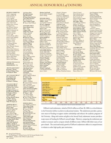 Annual Honor Roll of Donors REUNION COMMITTEE: Fred G. Augspurger James H. Beatty, Sr. Curtis R. Bryant Carl A. Buehler Martha Morgan Bull Ardath Edwards Cade Nancy Neely Cash Barbara Tracy Cochran D. David Cryer Julia Whitney Dawson Theodore D. Driscol Ralph R. Edminster dec Robert L. Erickson Patrick M. Ewing Jerry G. Gaff Carolyn Beasley Gilbert Joanne Toates Huffman James E. Huitema Carolyn T. Jones Howard F. Lund W. Thomas McGhee K. David Miller Nancy Waymire Munroe Charles E. Ray Sharon Moore Robinson Sandra Swisher Sammons David R. Sheaffer Alice Jones Slanec Diane Woodward Snelson Eleanor Selle Stanley Albert A. Watts, Jr. Nancie Clark Williams ANNUAL FUND: $415,153 DONORS: 283 PARTICIPATION: 75% TRUSTEE ASSOCIATES** u George L. Mazanec u Sharon Williams Ubben u Timothy H. Ubben EAST COLLEGE CIRCLE** u G. Richard Locke u Judy Blang Locke u Janet W. Prindle u Edward L. Unterberg OLD GOLD CIRCLE** Carol Shanahan Bryant u Barbara Tracy Cochran Robert N. Davies u Ralph R. Edminster dec u Emily Hooton Hamilton u Douglas A. Holmes u Carolyn T. Jones David N. McKeag u Nancy Waymire Munroe Donald G. Norman G. Byington Pratt III Walter W. Sampson, Jr. CHARTER CIRCLE** u James H. Beatty, Sr. James H. Boyd u Martha Morgan Bull Robert G. Burney u D. David Cryer Nancy Ruyle Dodge u Theodore D. Driscol u Robert L. Erickson Suzanne Wedeking Frederickson u Carolyn Beasley Gilbert David E. Harris Carole Kelly Hegenbarth William C. Krueger, Jr. u Marilyn Hansen Lancaster u Thomas A. Lancaster Charlotte Nelson Lueckel Ernest F. Modzelewski