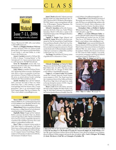 Terrace, Warwick, RI 02889. Jill’s e-mail address is jilljrowe@hotmail.com. Peter D. and Meighan (Henderson ’94) Krone announce the birth of their son, Spencer Joseph Krone, Feb. 3, 2006. Spencer joins brothers Ethan, 5, and Charlie, 2, and sister Mollie, 4, at their home in the Phoenix area. Aaron J. Lucchetti returned to DePauw, Feb. 9, 2006, to discuss “Covering Katrina” at The Gertrude and G.D. Crain Jr. Lecture Series. Aaron is a staff reporter for The Wall Street Journal. Kevin M. Mendenhall and his wife, Lori, announce the birth of their son, Noah Alexander Mendenhall, Feb. 3, 2005. They Kyle J. Salyers is a member of Indiana University’s Advancing Indiana economic development team. Kyle is a senior vice president of new business ventures at Thomas P. Miller and Associates. He serves on several advisory boards, including DePauw’s 361° National Advisory Board. Jennifer Steadman Ryan and her husband, Steve, announce the birth of their son, Rolan James Ryan, Sept. 1, 2005. Jennifer is a professional geologist with the Sarasota (Fla.) County government. Steve is an environmental analyst with Progress Energy. They live in Palmetto, Fla. Their e-mail address is jsryan@bigfoot.com.