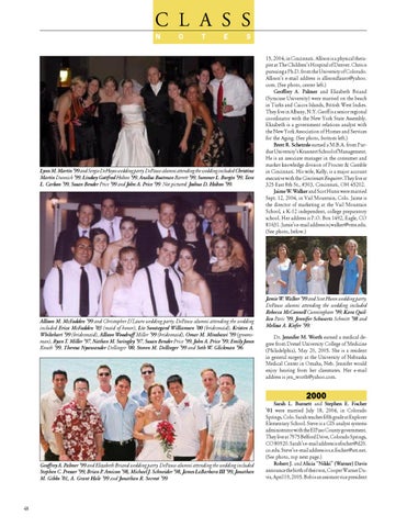 15, 2004, in Cincinnati. Allison is a physical therapist at The Children’s Hospital of Denver. Chris is pursuing a Ph.D. from the University of Colorado. Allison’s e-mail address is allisondlauro@yahoo. com. (See photo, center left.) Geoffrey A. Palmer and Elizabeth Briand (Syracuse University) were married on the beach in Turks and Caicos Islands, British West Indies. They live in Albany, N.Y. Geoff is a senior regional coordinator with the New York State Assembly. Elizabeth is a government relations analyst with the New York Association of Homes and Services for the Aging. (See photo, bottom left.) Brett R. Schetzsle earned a M.B.A. from Purdue University’s Krannert School of Management. He is an associate manager in the consumer and market knowledge division of Procter & Gamble in Cincinnati. His wife, Kelly, is a major account executive with the Cincinnati Enquirer. They live at 325 East 8th St., #303, Cincinnati, OH 45202. Jaime W. Walker and Scot Hunn were married Sept. 12, 2004, in Vail Mountain, Colo. Jaime is the director of marketing at the Vail Mountain School, a K-12 independent, college preparatory school. Her address is P.O. Box 1492, Eagle, CO 81631. Jamie’s e-mail address is jwalker@vms.edu. (See photo, below.)