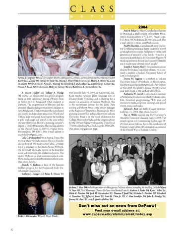 Serena J. Longyear ’02 and Christopher Smith wedding party. DePauw alumni attending the wedding included Kathryn D. Ewing ’02, Christi D. Soule ’02, Macey E. Wenzel ’02 (bridesmaid), Hilary A. White ’02, Lara M. Rutan ’02 (bridesmaid), Nancy C. Yearing ’02, Kimberly A. Richardson ’02, Katherine D. Gibson ’02, Nicole P. Lund ’02 (bridesmaid), Haley A. Carney ’02 and Katherine L. Sermersheim ’02. A. Nicole Hallett and Tiffany A. Hodge ’02 started an educational non-profit program based on their experiences during a Winter Term in Service trip to Bangladesh while students at DePauw. The program is in its fifth year and has provided educational opportunities to children in rural Bangladesh. The first students have graduated and started undergraduate education. Nicole and Tiffany hope to expand the program by building a girls’ orphanage and school in the area within the next three years. Nicole is pursuing a master’s degree at Oxford University. Her mailing address in the United States is 2619 E. Poplar Drive, Bloomington, IN 47401. Her e-mail address is nicole.hallett@gmail.com. Leila C. Hernandez lives in Austin, Texas. She works at Majic 95.5 radio station. She is co-founder and co-host of The Austin Movie Show, a weekly live TV program on the Austin Music Network. On her weekly show, she reports on the local film scene and interviews film makers and actors. The show’s Web site is www.austinmovieshow.com. Her e-mail address is leila@austinmovieshow.com. (See photo, below.) Shanda N. Jackson is head of the business builders program for the Hammond (Ind.) Development Corporation. Kathryn J. Longer and Brian E. Dixon ’01