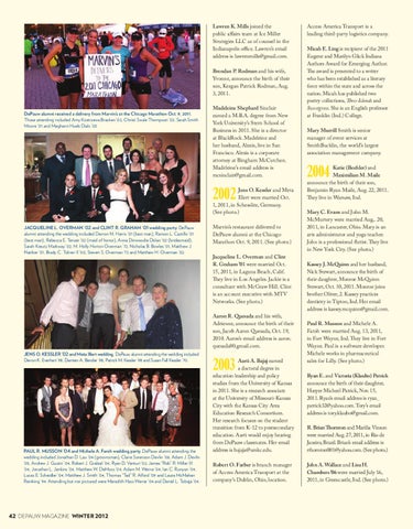 DePauw alumni received a delivery from Marvin’s at the Chicago Marathon Oct. 9, 2011. Those attending included Amy Kostrzewa Bracken ’02, Christi Soule Thompson ’02, Sarah Smith Moore ’01 and Meghann Huels Dials ’03.