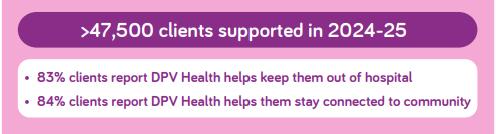 Client satisfaction: 89% of survey respondents reported a “high/very high” level of satisfaction with DPV Health services, including 88% among culturally and linguistically diverse respondents