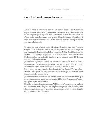 Ainsi le hooKey intervient comme un complément d’objet dans les déplacements urbains et propose une invitation à la pause dans nos villes toujours plus rapides. Les utilisateurs auront tout le loisir de s’approprier cet objet dans une grande liberté d’usage. Liberté qui à mon sens est importante dans notre société actuelle quelquefois un peu trop cloisonnée. Je remercie tout d'abord mon directeur de recherche Jean-François Gleyze pour sa bienveillance, sa clairvoyance au sein du projet et son humanité. Je remercie chaleureusement Médy Sejai Directeur de la Direction des espaces publics de la Mairie de Montreuil et Damien Beslot membre du collectif Quatorze pour m'avoir accordé de leur temps pour les interviews. Je remercie également toutes les personnes présentes dans la scénarisation avec par ordre d'apparition : Hanifa, Olivier, Valérie, Victor, l'homme en tenue sportive essayant le vélo, Cristian et Eric. Merci à tous les responsables d'ateliers et studio, Roland, Xavier, Johan, Didier, Denis pour son implication dans le montage du podium pour tester le potelet face au jury. Je remercie mes camarades de promo pour les soutiens mutuels que nous nous sommes apportés, les bonnes idées et la "buena onda" générale qui a régné toute l'année. Et enfin, je remercie ma compagne Valérie qui m'a soutenu tout au long de cette année, ma fille pour son implication ponctuelle dans le projet et sa compréhension et toutes les personnes qui m'ont soutenu de près ou de loin dans ma démarche.