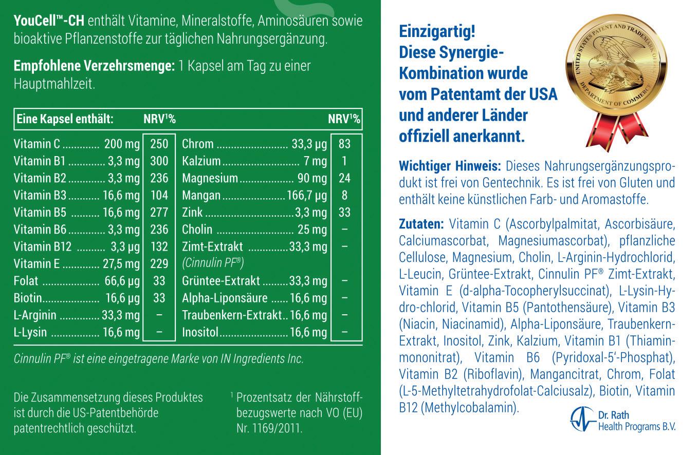 YouCell™-CH; Nicht nur für die Blutzuckerregulation ist der Zuckerstoffwechsel im Körper von grundlegender Bedeutung. Jetzt im neuen handlichen Format und zu einem unschlagbaren Preis: Vitamine, bioaktive Pflanzenpower und andere Mikronährstoffe unterstützen in jeder Kapsel ganz natürlich den Zuckerstoffwechsel.