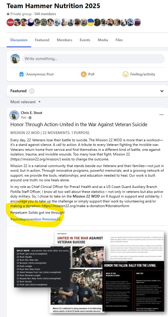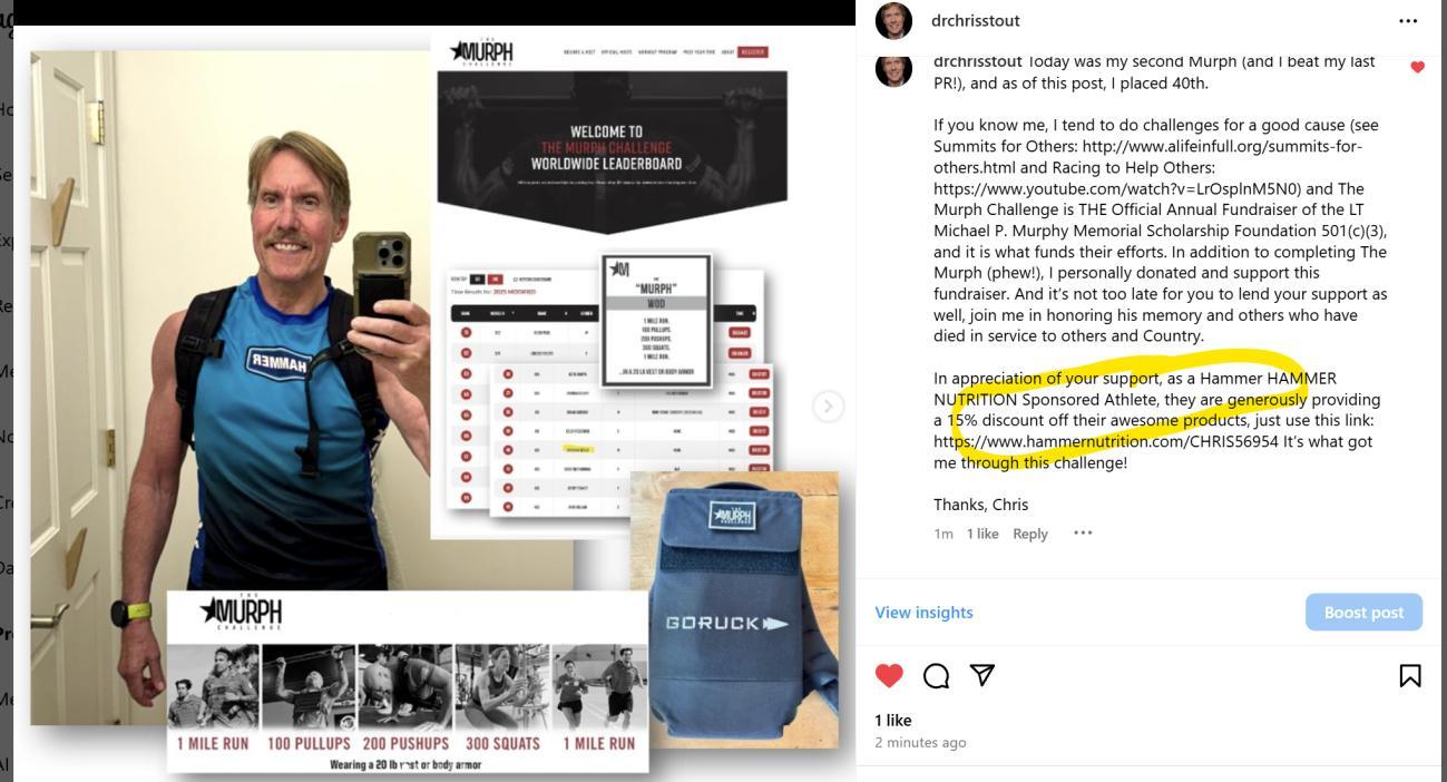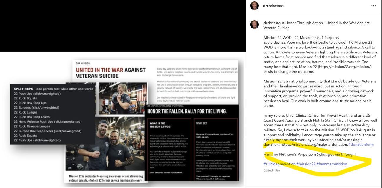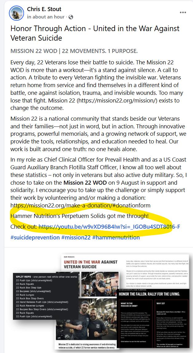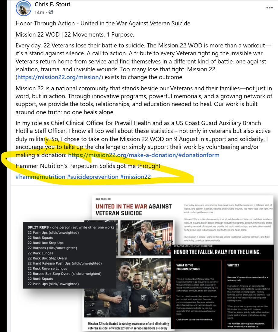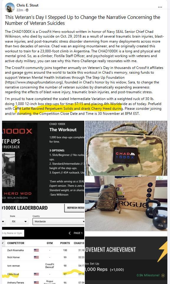 Facebook Dr Chris Stout’s Personal Page (>4900 friends, >5500 Followers) https://www.facebook.com/drchrisstout/ Veterans Day Hero WOD - CHAD1000X Veteran Suicide Prevention