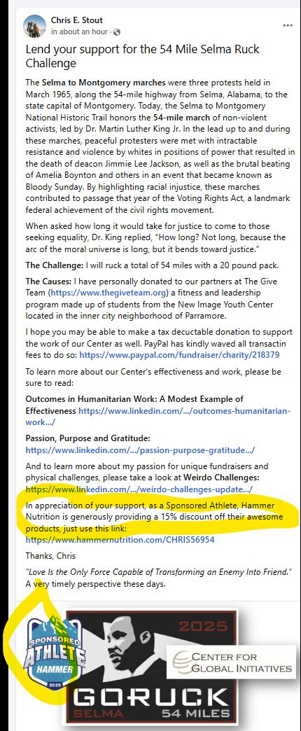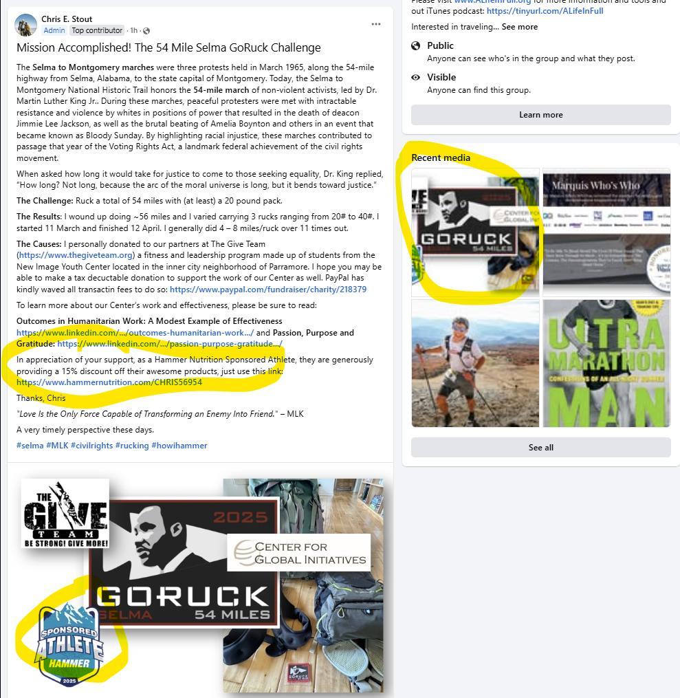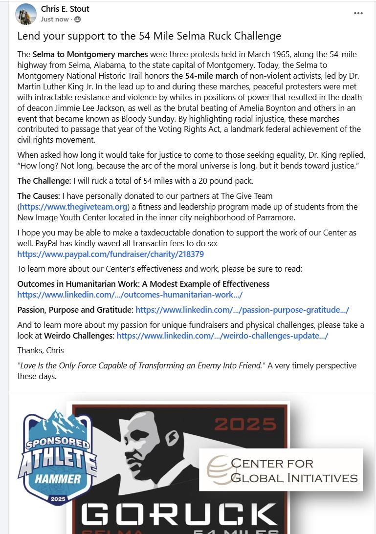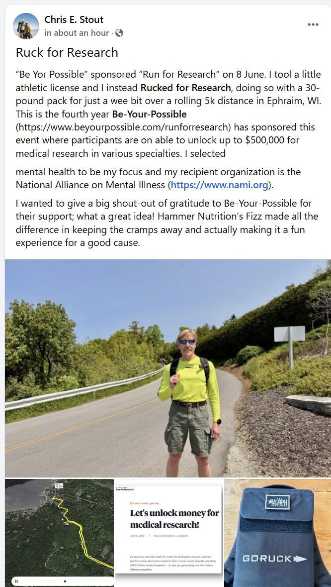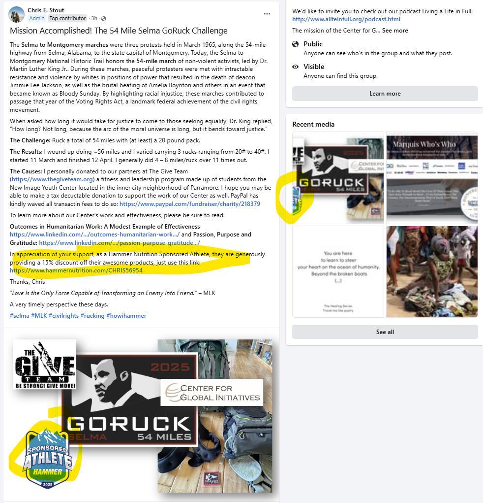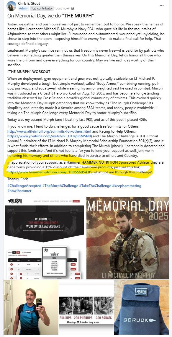 Facebook Dr Chris Stout’s Personal Page (>4900 friends, >5500 Followers) https://www.facebook.com/drchrisstout/ Veterans Day Hero WOD - CHAD1000X Veteran Suicide Prevention